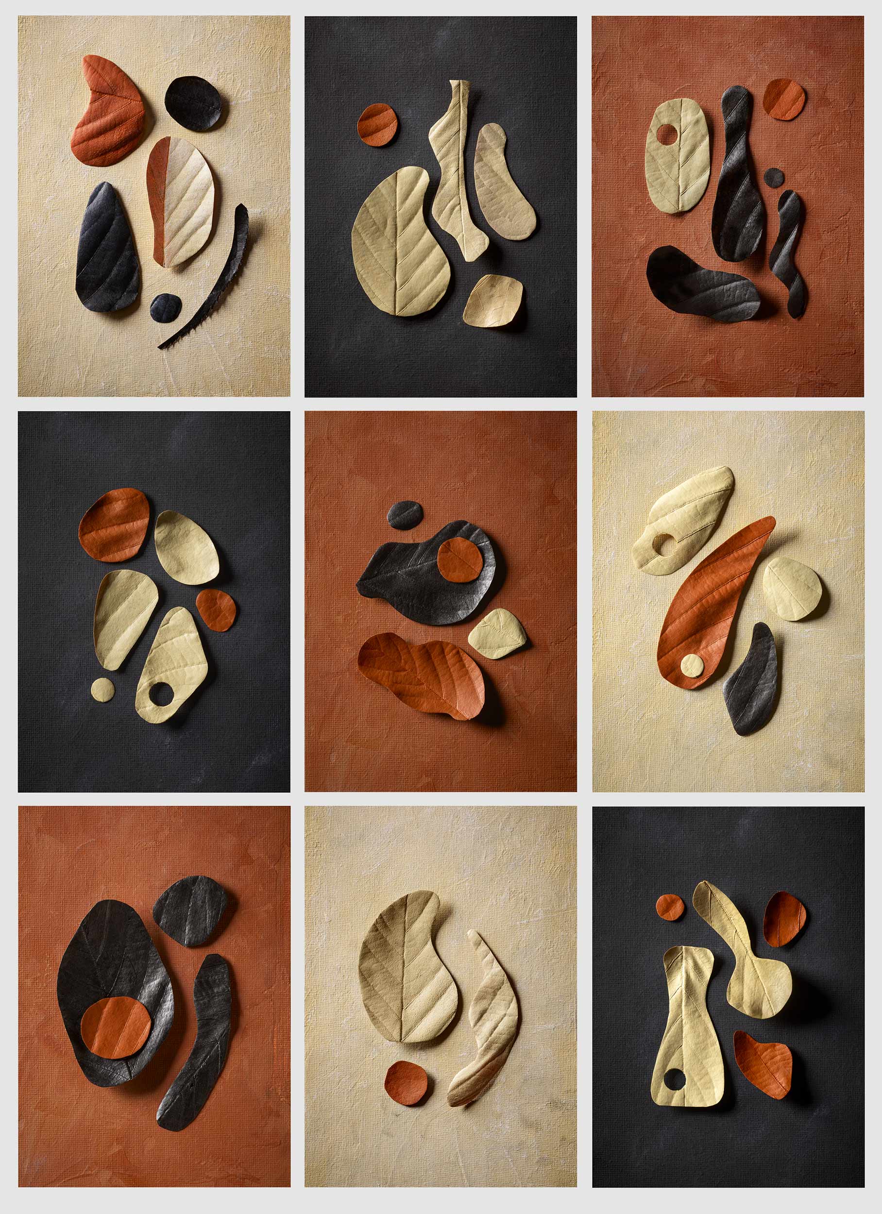 I wanted to make photographs that felt calm, resolved and that could exist comfortably on a wall. Inspired by contemporary abstract graphic painting, the work plays with simple shapes and carefully chosen colour. The compositions are made from cut-out leaves, some painted, used not for their botanical identity but for the texture and irregularity they introduce. Up close, the substance becomes apparent; from a distance, the images remain abstract. Sara Morris